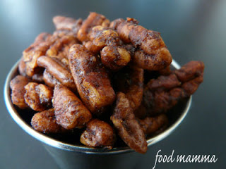 Preheat the oven to 325 degrees. Place the pecans on a baking sheet and bake just until you smell the pecans. Combine all the other ingredients and toss with the baked nuts. Place the nuts back on the baking sheet and bake for another 10 minutes. Let the pecans cool for a few minutes before you devour them.