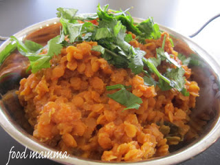 Red lentil curry is one of our new favorite dishes. This hearty meal is perfect after a weekend filled with meat. I’m not sure if the best part is that it’s healthy or that it takes less than half an hour to make. It also passed the Q test. He ate this curry alongside some homemade yogurt and devoured it. Both my mom and aunt have made this dish so I snagged the recipe last week. A perfect dish for Meatless Monday.