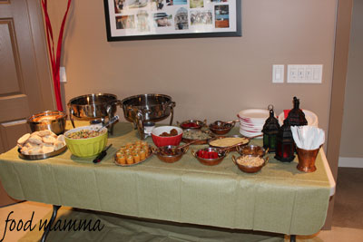 Floors and tables were decorated with amazing lanterns from a friend who had used them at her July wedding as centrepieces (thanks A!). Food was served in copper serving dishes, water from a copper pitcher (thanks S!).
