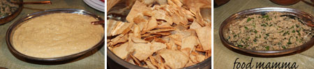 Bowls of baked pita chips waiting to be dipped in creamy hummus and chunky baba ghaouj.