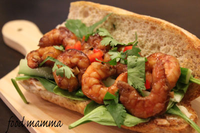 A sandwich seemed like the perfect thing but no ordinary sandwich would do. I had bought lemongrass the day before and thought it would be great with shrimp. Settled into a bun, it was the delicious Asian fast food at home.