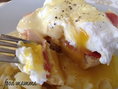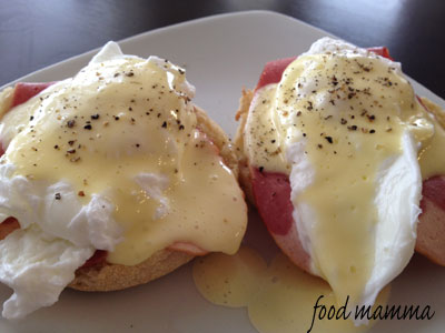 The perfectly cooked poached egg was laid upon a slice of turkey bacon on an english muffin. Topped with the buttery sauce and some pepper, it was a tasty way to start the day.