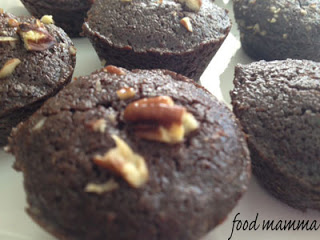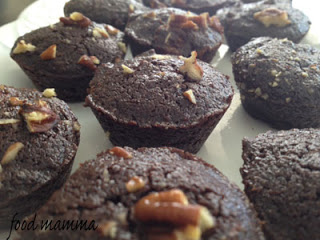 Roughly chop the pecans and stir most of them into the brownie batter. Divide the batter into the muffin pans and sprinkle the remainder of the pecans on top.