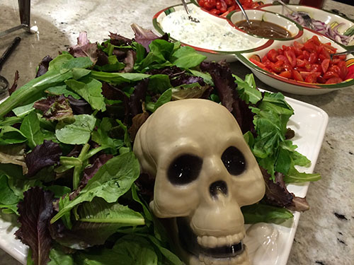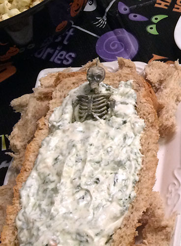 Take your favourite spinach dip and decorate it for the season. Instead of using a sourdough bowl, use a loaf of unsliced bread. Cut the middle out, fill with dip and make some room for a skeleton to lie. This was a hit at one of our parties.