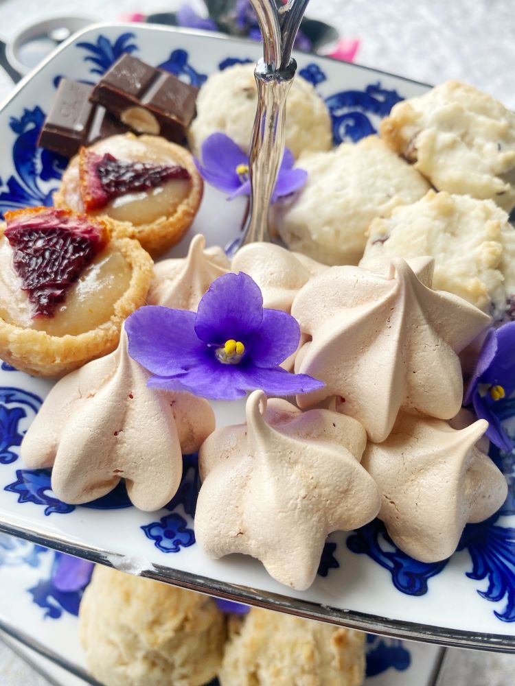 Get creative with the treat section. I had so many ideas for this layer but ended up with just a few – mini tarts filled with blood orange curd (or lemon curd), dark chocolate, rose petal shortbread (or whipped shortbread if you prefer). Meringue kisses were the final touch and are super easy to make. Make your favourite meringue base, add in a splash of rose extract and some food colouring if you wish. Fill a pastry bag with the meringue and pipe using a large tip, like a 2D. Other options for this tier can include cakes, cookies, tarts….whether you make it at home or from your favourite bakery.