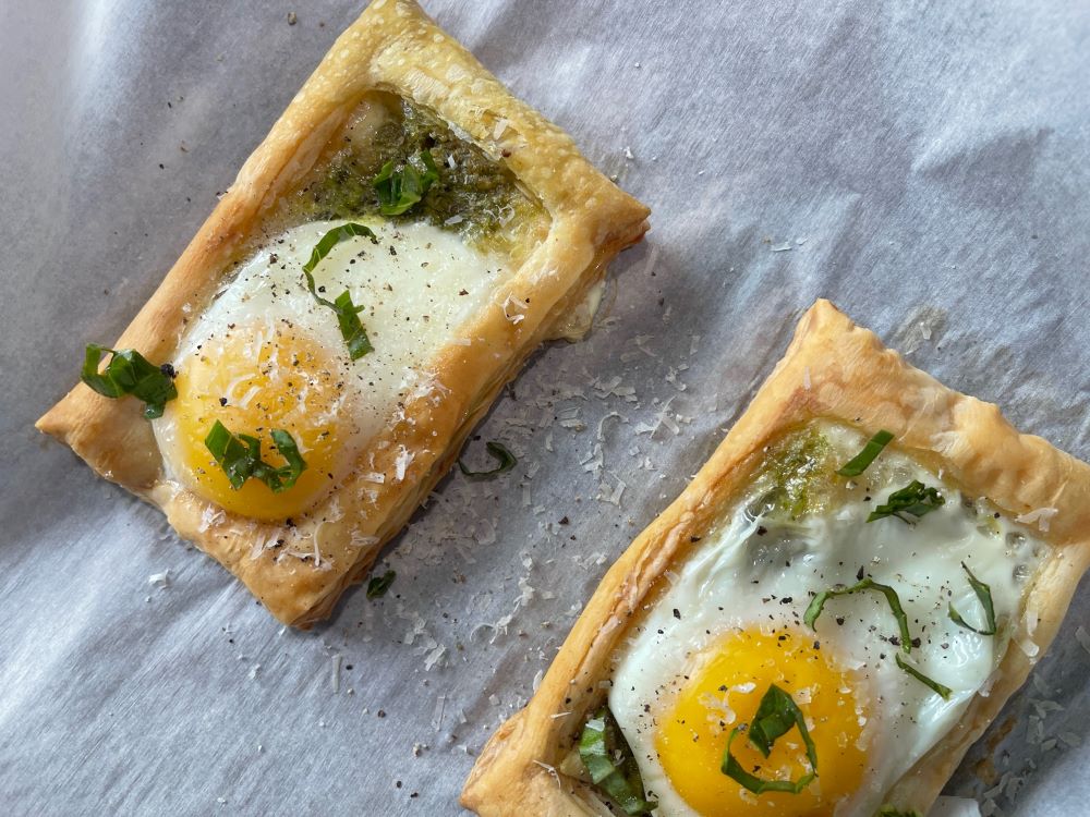 Once these pastries come out of the oven, grate some parmesan over the eggs and garnish with basil. The cheese just melts into the eggs and the basil complements the pesto so well.