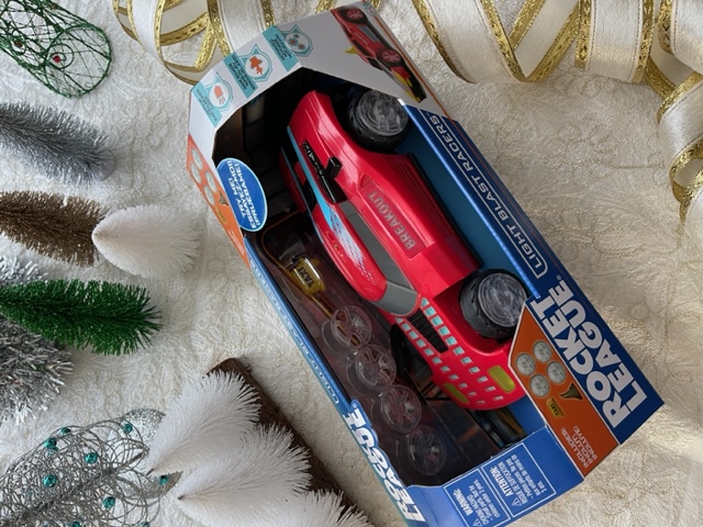 My 8 year old was all over this toy. The Rocket League Light Blast Racer has all the same features as the car made famous in the video game. You can customize it to make the perfect vehicle. It features working headlights and taillights, light-up graphics, light-up translucent toppers, and translucent interchangeable wheel covers. Each vehicle includes a replica game ball.