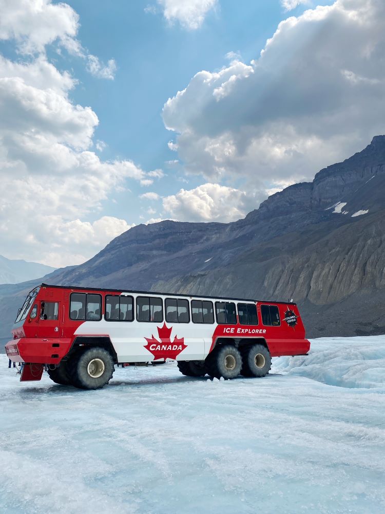 About an hour away from Jasper, you can find the Columbia Icefields, the largest icefields in the Rockies. From the Columbia Icefield Glacier Discovery Centre, you take a bus to the transfer station where you then board an Ice Explorer that takes you right to the glacier.