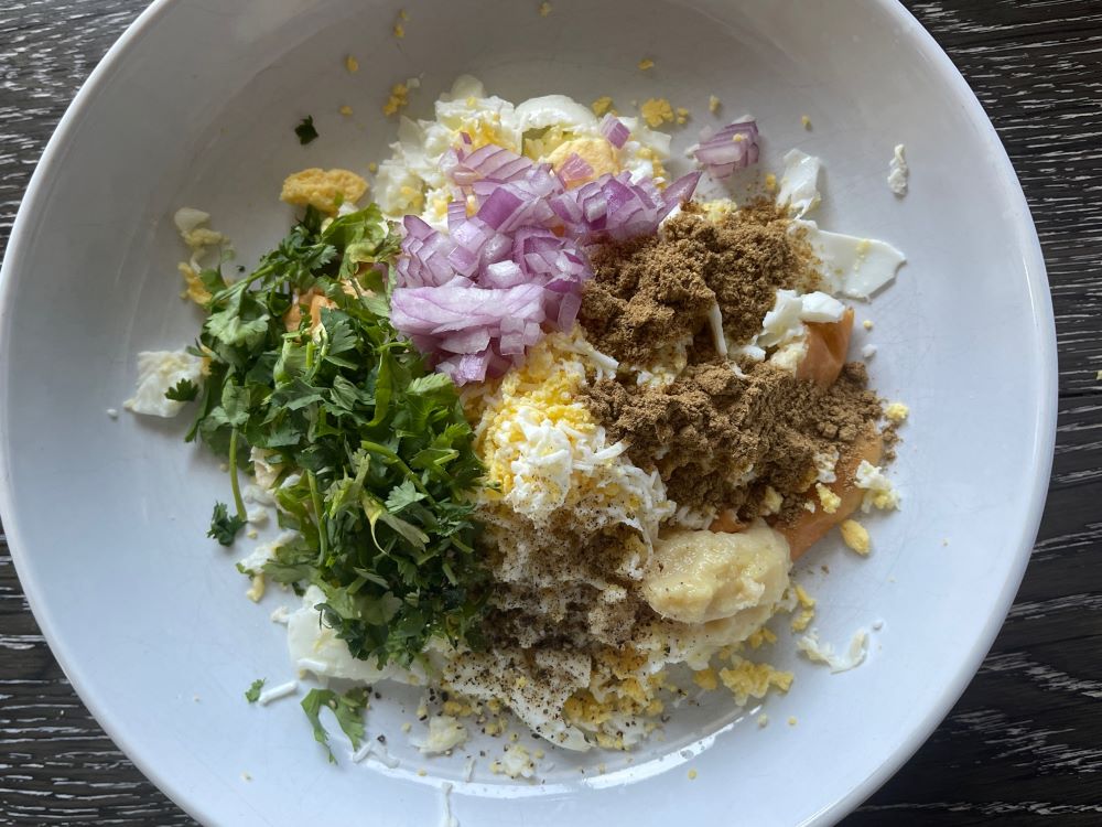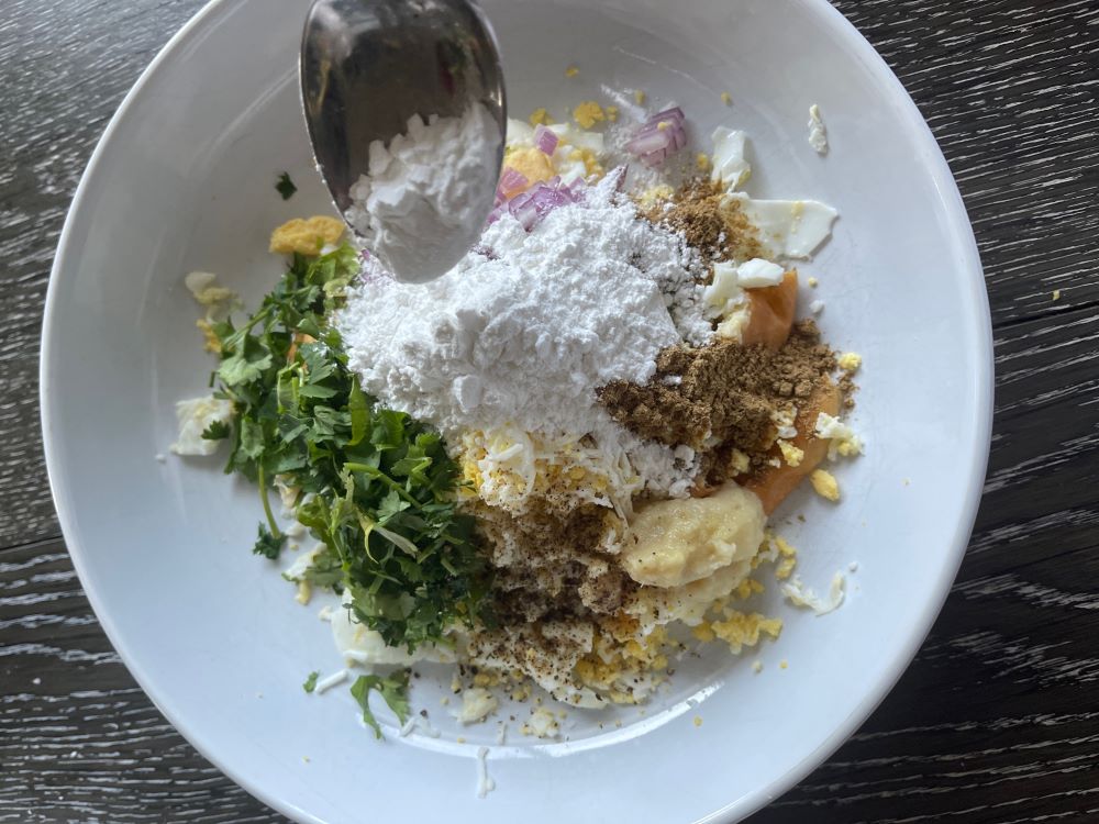 Each batch of these fritters contains two hard boiled eggs, grated into the mixture. The eggs are combined with a couple pieces of bread and spices like garlic, ginger, cumin and coriander. Rice flour is used to bind it all together, making it easy to roll into balls.