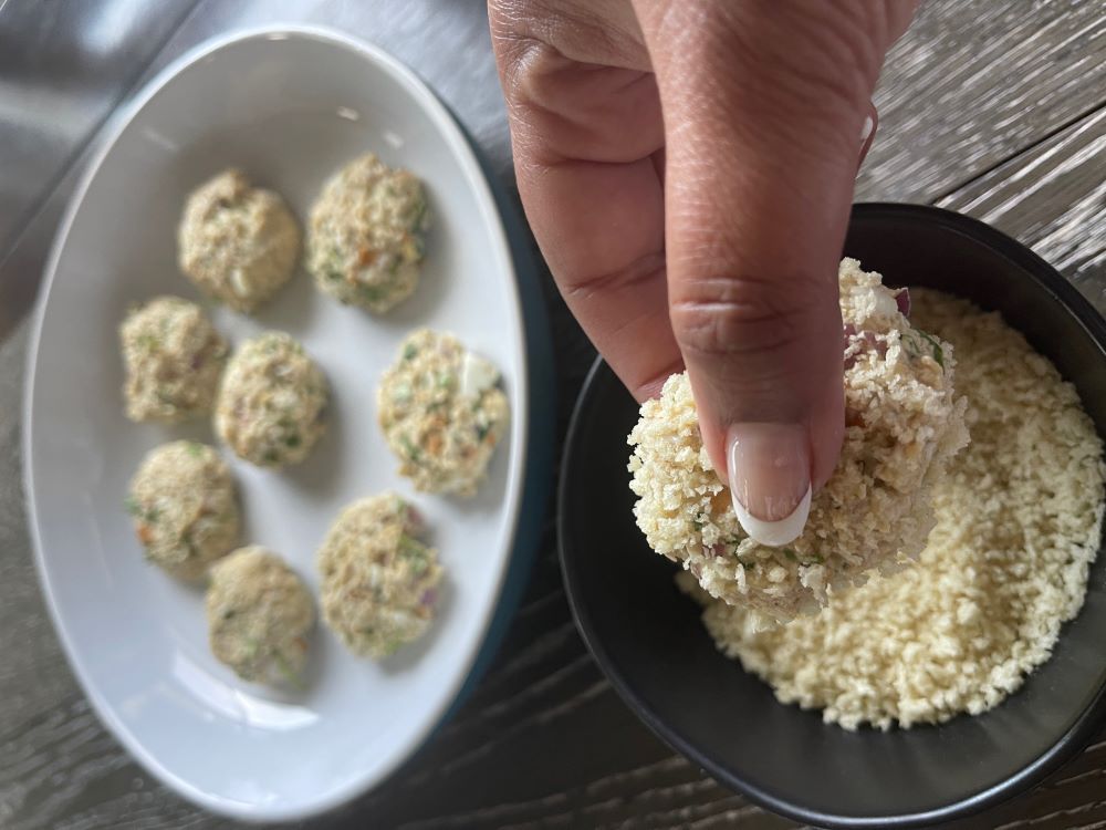 These egg fritters are reminiscent of falafel but lighter in texture. To ensure that each ball looks the same, I use a cookie scoop to ensure that every fritter is the same size. Each ball is coated in panko and pan fried.