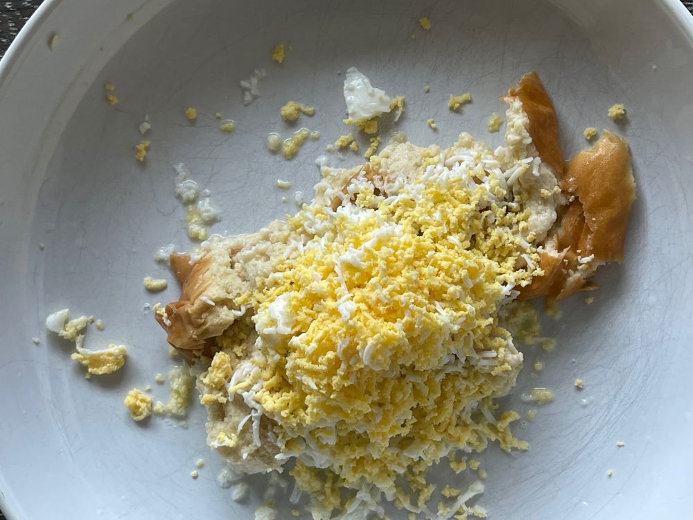 - Peel the hard boiled eggs and then grate them on top of the bread.