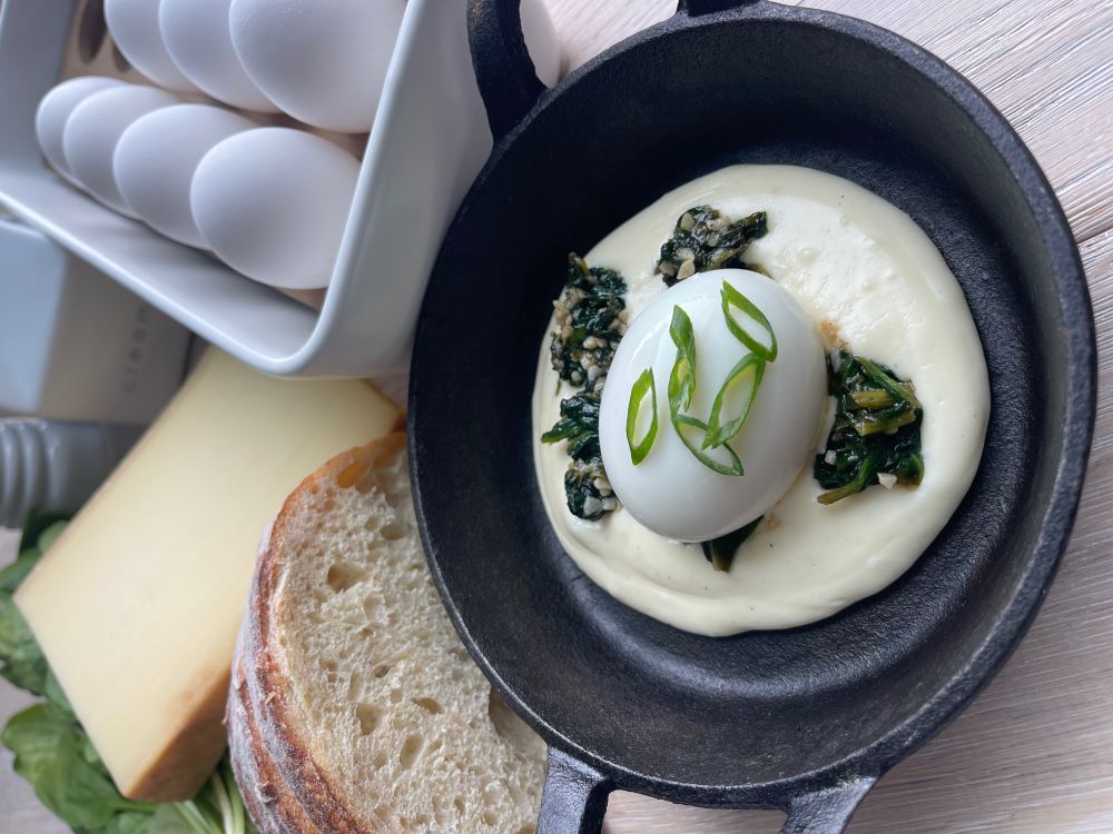 - In a dish, add a layer of cheese sauce, top with spinach and the egg. Serve with bread.