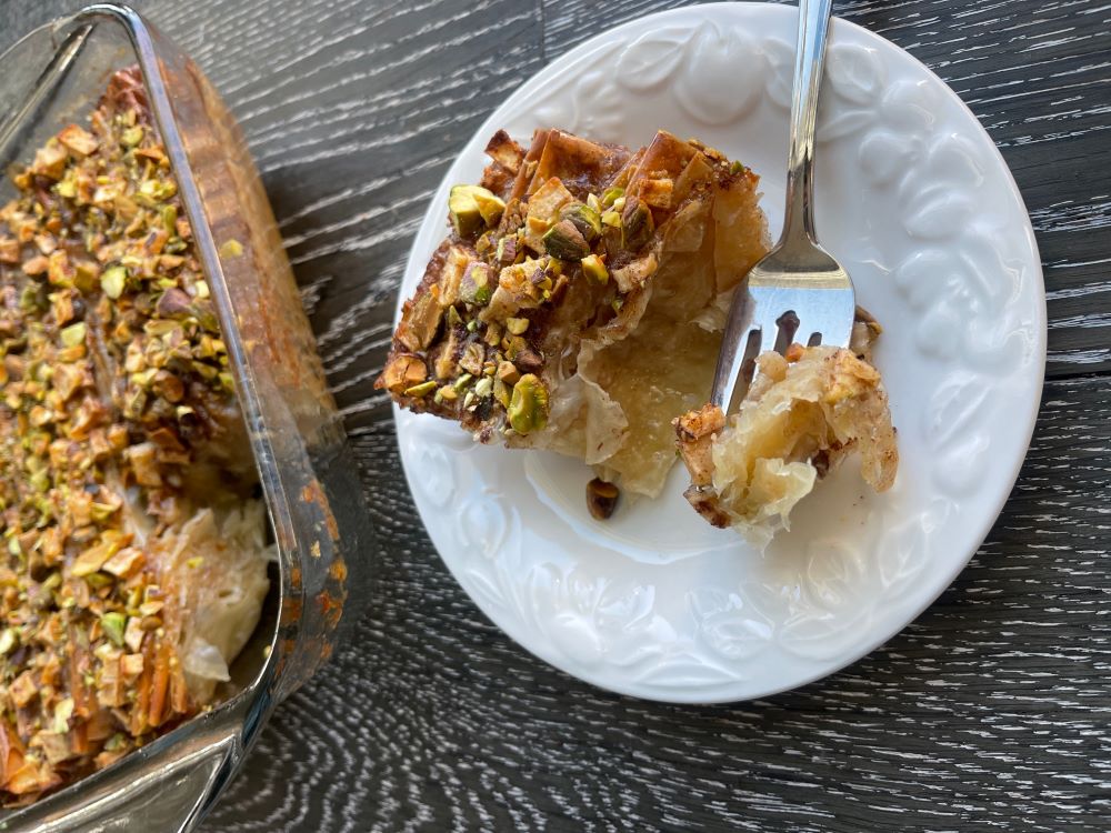 Crispy on the top, creamy and custardy on the inside, this apple and cinnamon phyllo pie delicious and comforting.