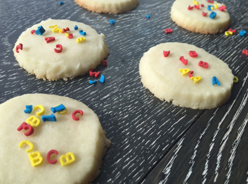 Looking for something sweet to pack into your little one’s lunchbox? Shortbread cookies are a hit with everyone. They are super easy to make and a great vehicle for sprinkles. Although whipped shortbread are my go-to, you can roll out this dough and cut out your favourite shapes.