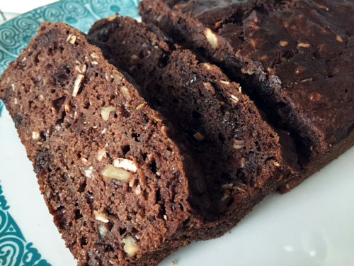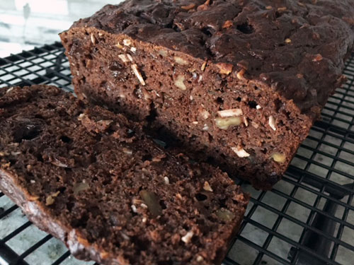 When I checked the garden yesterday, I was thrilled that there were zucchini! I was so excited, I picked one out and decided to do some baking after everyone had gone to sleep. My favourite use of zucchini is a chocolate loaf. I wanted this to be filled with all the things so loaded up this loaf with chocolate chips, pecans and coconut.