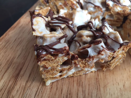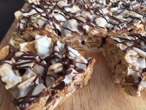 Melt the butter in a pot. Add marshmallows and let them melt. Once melted, pull off the heat and add the cereal. Pour the mixture into a greased 9″ x 9″ pan and let cool. Melt the chocolate chips and place the melted chocolate in a sandwich bag. Cut off the tip and drizzle over the cereal mixture. Cut into squares and enjoy!