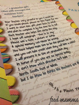 Last year, his first year of preschool, I had found this fabulous idea from Pinterest – have every teacher from preschool to grade twelve sign the encouraging Dr Seuss book “Oh, the Places You’ll Go”. The book is inspirational and to have each teacher throughout the years write a special note to your child is just precious. How terrific of a graduation gift is this!