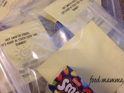 To keep in touch with all his friends from school, I got inspired with this great idea from Becoming Martha with her Stay in Touch cards. I wanted to make cookies with a little note for all Q’s friends. After a crazy busy weekend though, the last thing I wanted to do was be in the kitchen. Instead, I bought everyone smarties and attached a little note. Simple and quick but with a terrific treat.