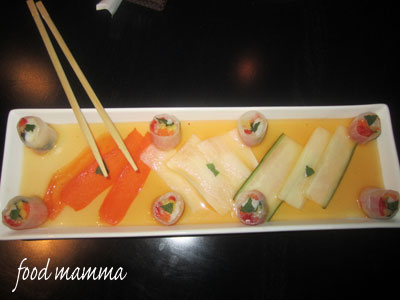 It was hard to decide which appetizer, everything looked so good. We decided to share the BC Spot Prawn and Papaya Salad Roll. This was a really pretty dish to look at. Eight mini rolls were served on a long platter on top of strips of cucumber, carrot and daikon. It was really tasty and left us wanting more.