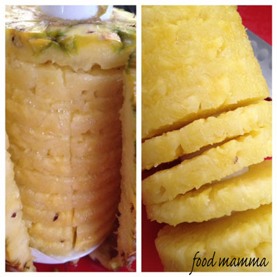 I used a pineapple corer that I had borrowed from my dad and it worked perfectly! I was surprised at how easily it cut the pineapple into perfect rings.