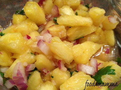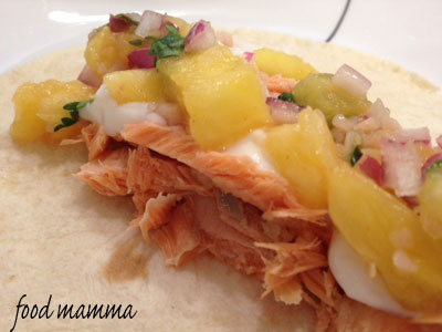 I added some red onion, garlic, a squeeze of lime and a squirt of hot sauce topped off with some salt and cilantro. The sweet pineapple with the savoury onions and some heat was tasty and went perfect with the leftover salmon that we made tacos with. The remainder was scooped up with some salty taco chips. So much for leftovers!