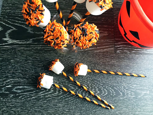 I love patterned paper straws and there are so many orange and black options available. Just stick one into a marshmallow, dip in melted chocolate and then dip into a dish of sprinkles. These are always a hit and can be prepared in minutes.