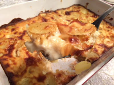 Arrange the potatoes in a baking dish. Pour sauce over top, allowing the sauce to completely cover the potatoes.