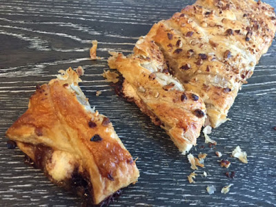 Roll out the puff pastry. Sprinkle the cheese on the pastry and fold it in half. Roll it out again so that the cheese gets incorporated into the dough. Sprinkle the seeds on top of the pastry and run the rolling pin over it so that the seeds get embedded into the dough. Cut strips and place them on a parchment-lined cookie sheet, giving them a little twist. Bake at 350 degrees for 15 minutes or until golden brown.