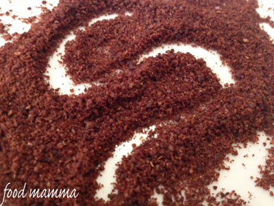 Sumac is a middle eastern spice that is burgundy in colour. The taste of sumac is lemony and tart but more complex than a lemon. It is used as a condiment, like salt, but also in spice rubs, dressings and marinades. The spice is gaining in popularity. In fact, Alton Brown named sumac his official spice of 2012.